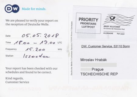 Potvrzení poslechu. QSL dorazil 29.5.2018