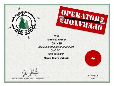 I přes moji spíš neaktivitu se mi podařilo nastřádat spojení s 50 aktivátory POTA. Diplom potěšil.