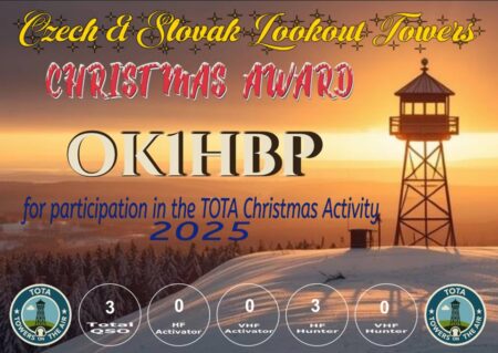Když už jsem začal diplomy, tak jeden z aktivity vysílání z rozhledem – TOTA. Díky vyhlášené vánoční aktivitě jsem dostal diplom za spojení a aktivátory.